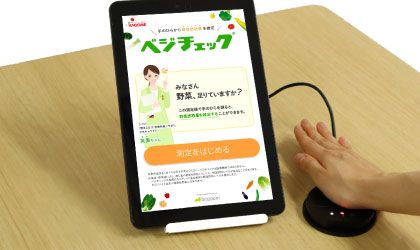 LEDを搭載したセンサーが皮膚のカロテノイド量を測定し、独自のアルゴリズムで算出することで、120段階の野菜摂取レベルと6段階の推定野菜摂取量の2つの結果を表示します