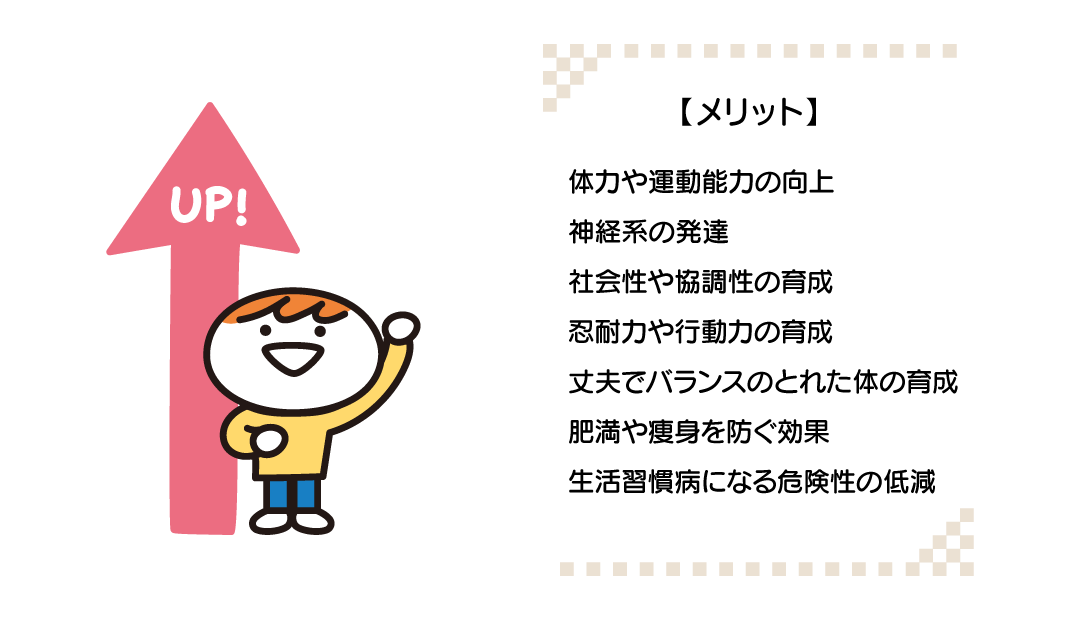また、運動習慣が将来の健康的な生活につながるというメリットもあります。