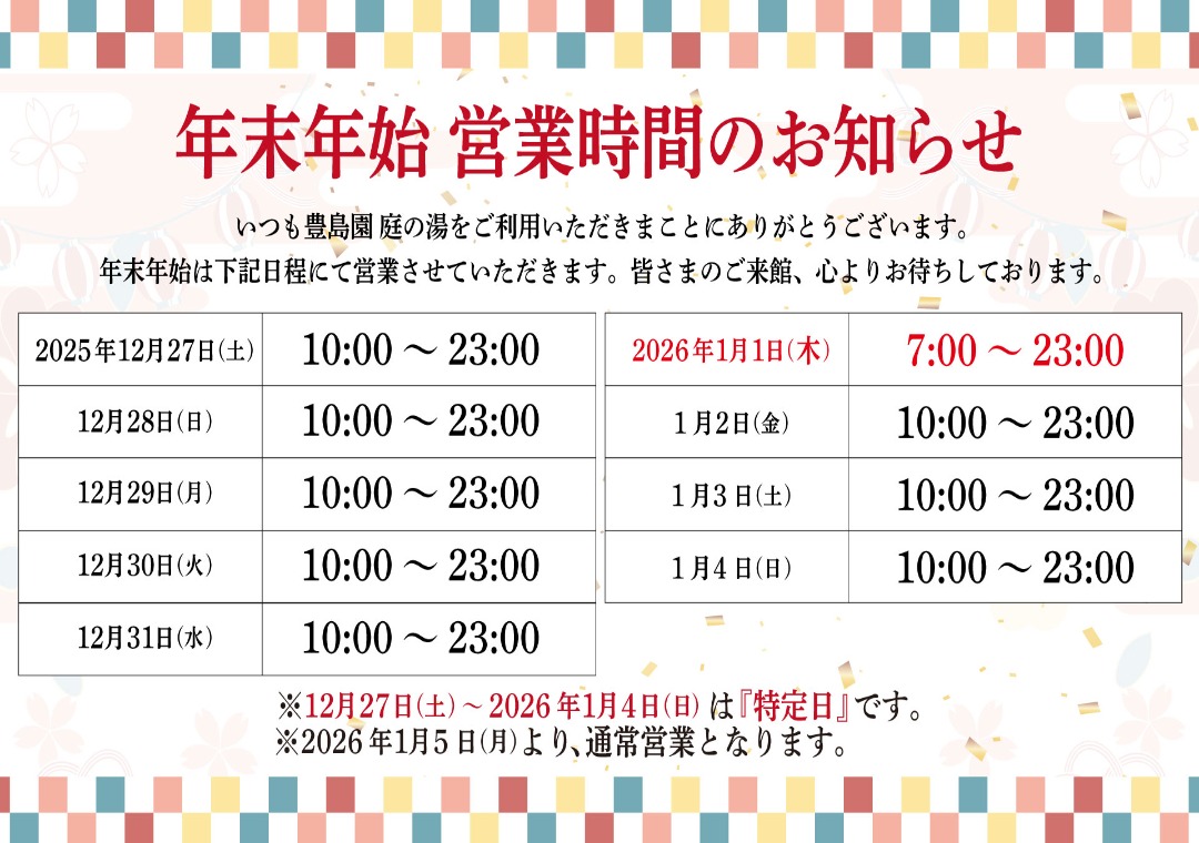 いつも豊島園 庭の湯をご利用いただき誠にありがとうございます。年末年始は下記日程にて営業をさせていただきます。皆さまのご来館、心よりお待ちしております。