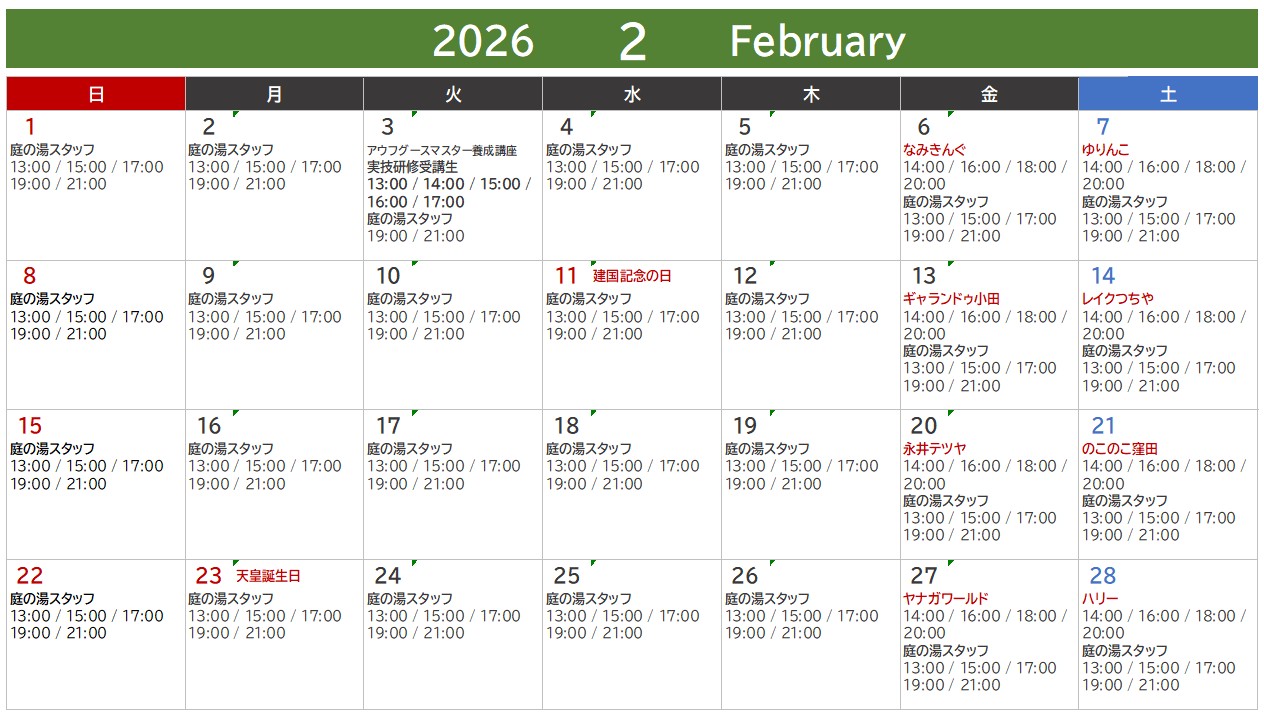 開始時間5分前になりましたら、屋外フィンランドサウナ前にお集まりください。