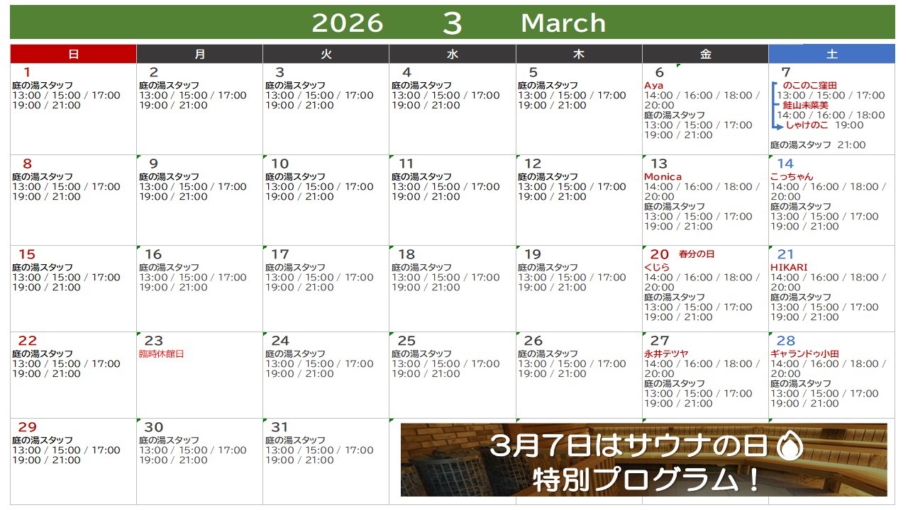 <注意>3/7(土)のみ開催時間が異なりますのでカレンダーでご確認ください。