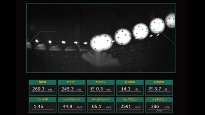 【測定項目】ボール初速、打ち出し角、バック・サイドスピン量、キャリー、飛距離、左右のブレ、ヘッドスピード、ミート率などのデータを分析できます。