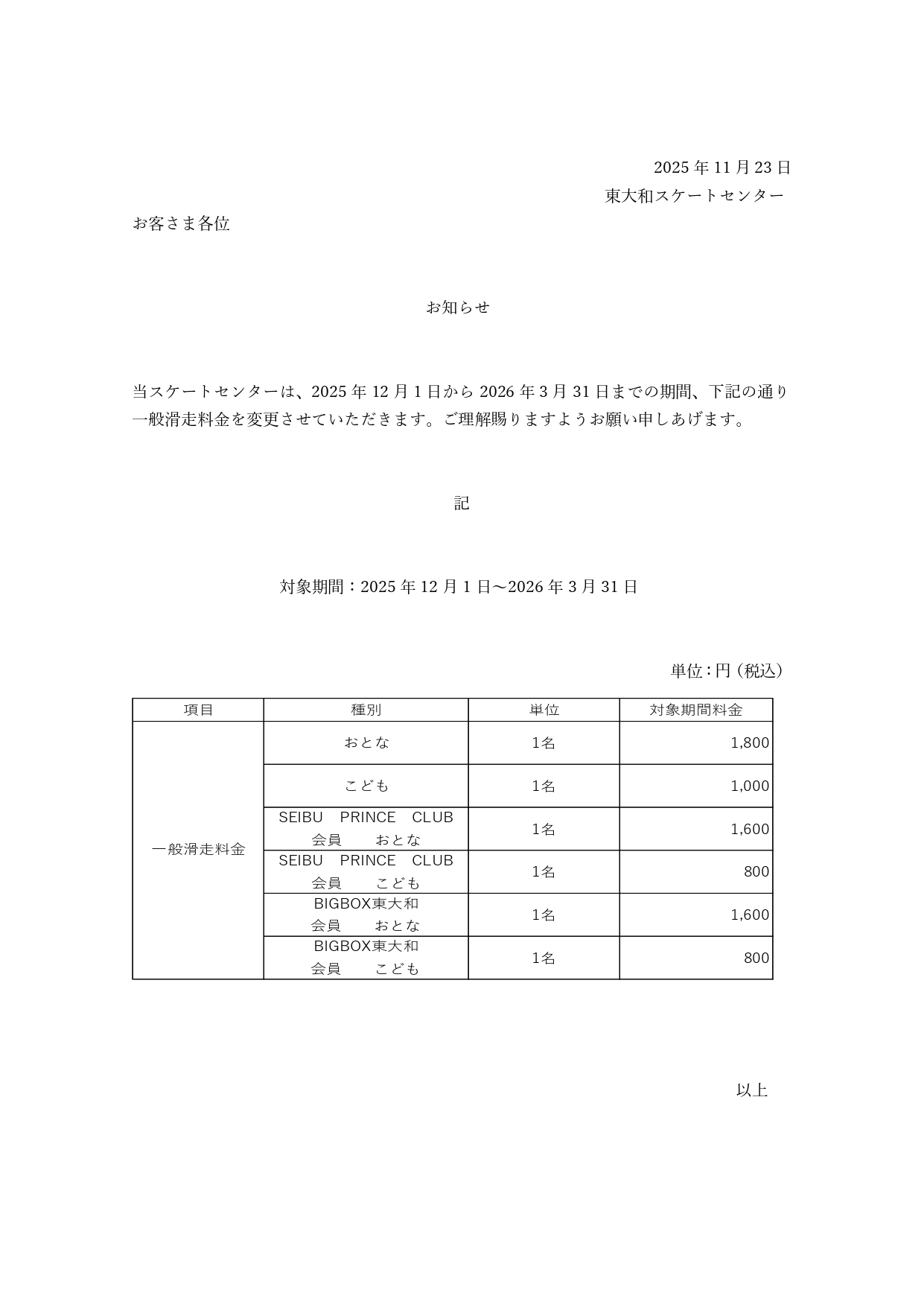 冬季期間(2025.12~2026.3)料金変更のお知らせ